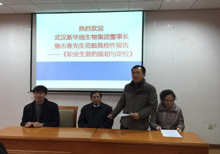 12月8日上午8点半,武汉新华扬生物集团董事长詹志春先生做客生科院,带来一场以“职业生涯的规划与定位”为主题的精彩报告,此次报告会由生科院副经理江正兵主持,许良发、张桂敏以及2013级6个班级的部分员工参加了此次报告会。
