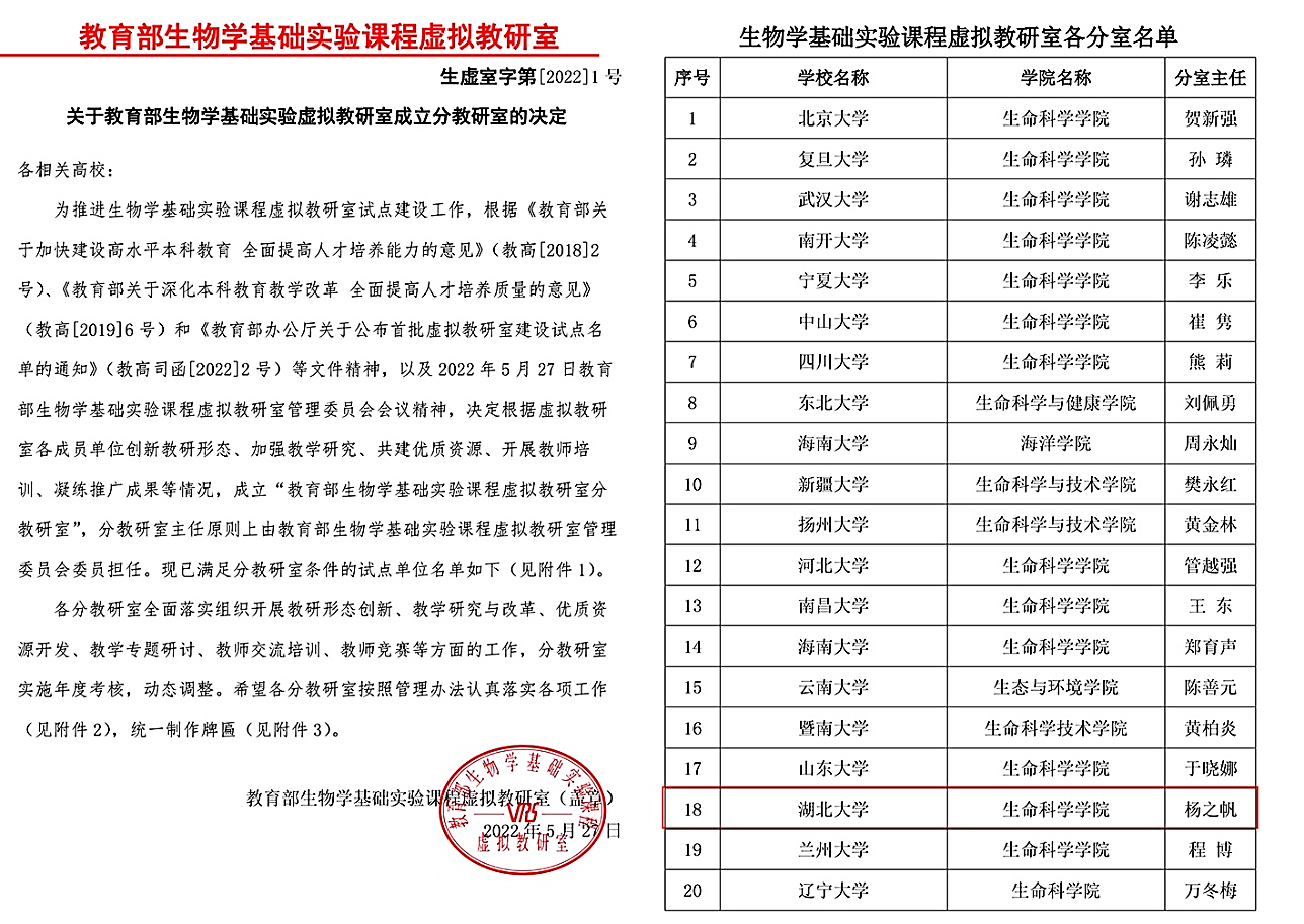 近日,生物学基础实验课程虚拟教研室召开管理委员会2022年第一次会议,会议决定在william威廉设置“教育部生物学基础实验课程虚拟教研室william威廉分教研室”,william威廉副经理杨之帆教授担任分教研室主任并当选教育部生物学基础实验课程虚拟教研室管理委员会委员。