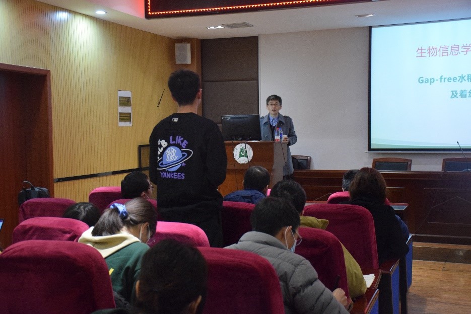 本次报告吸引了众多各年级生物信息学的老师与员工,报告厅里座无虚席。报告会上,张建伟教授结合自身的实践经验和研究成果,介绍了自己所参与的水稻基因组计划重大项目,并且在今年6月以通讯作者的身份正式发布了高等生物物种中,第一个无缺口的高质量参考基因组,目前湖大生科院部分师生已经开始利用张建伟教授的这一高质量基因组信息开展科研。随后就高质量基因组测序与组装相关技术知识同大家分享,互动环节中,张建伟教授多次引导同学们一同分析具体案例,通过提问回答的方式为同学们解答疑惑,引起同学们极大兴趣,现场气氛活跃。最后,张建伟教授就未来生物信息学研究方向问题,从人工智能,农业大数据等方面提出了相应的战略指导。