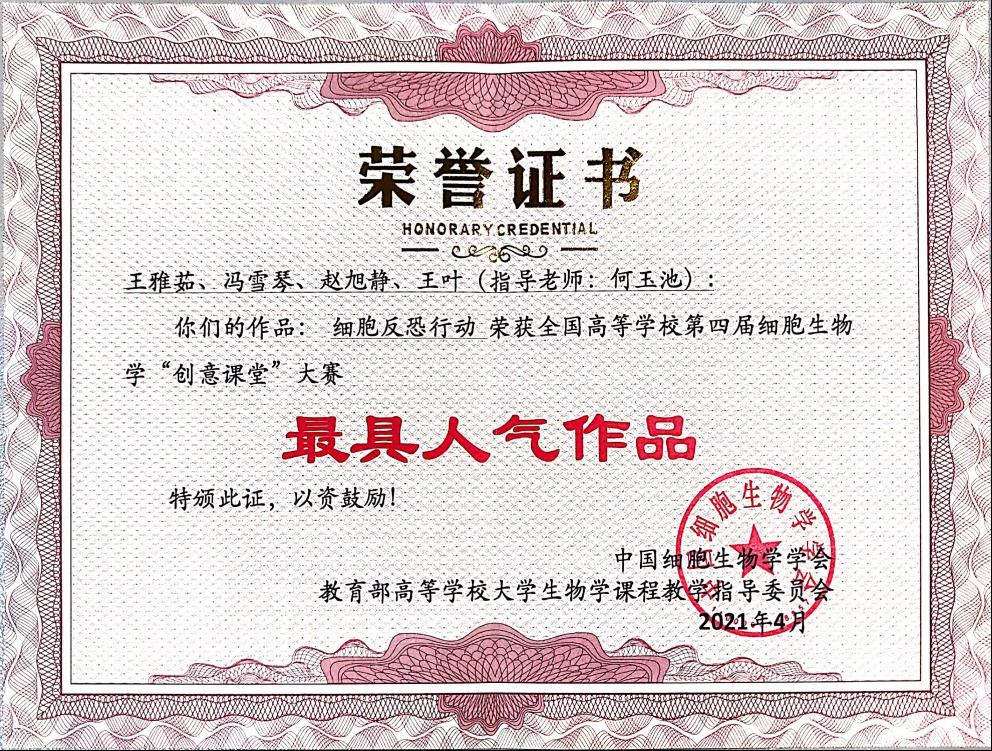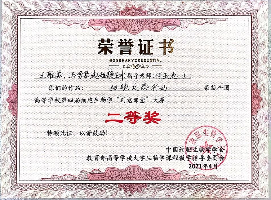 何玉池教授指导、王雅茹等同学创作的《细胞反恐行动》创意课堂作品获得全国二等奖。该作品是以表演为主,融合动画与歌曲的形式来创作的一部电影,电影中展示了致癌因子入侵、原癌基因病变、抑癌基因挽救三个过程。作品创意之处在于通过将各元素拟人化,合理设置角色之间的关系,借以表达细胞受到攻击时的一系列变化。