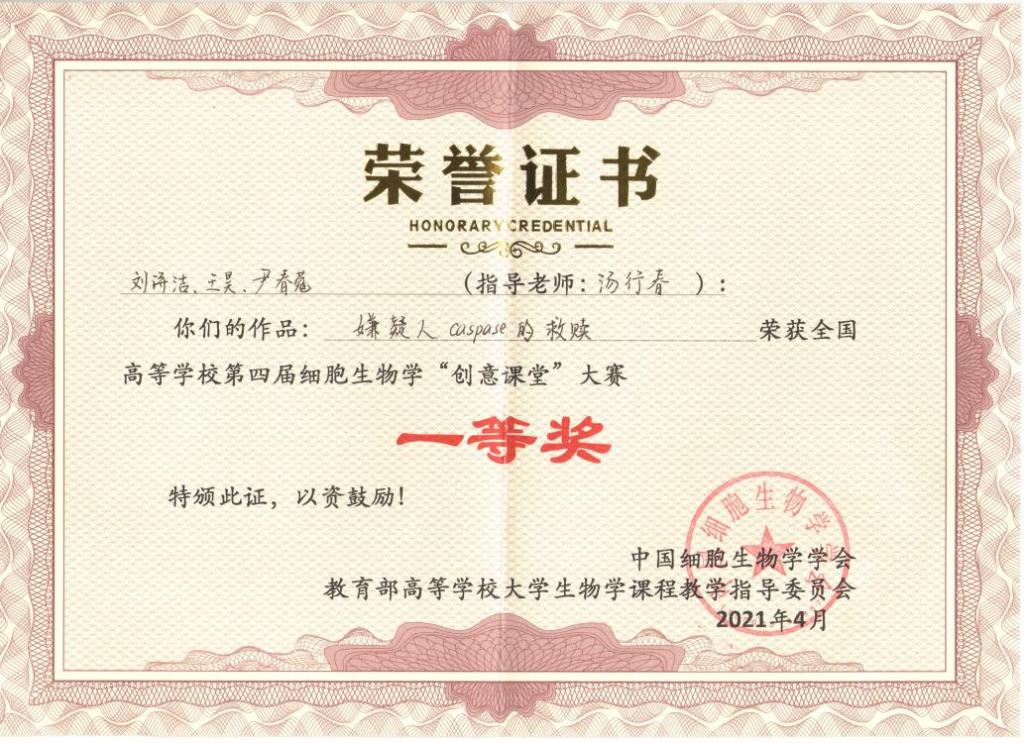汤行春教授指导、尹春蔻等同学创作的《嫌疑人caspase的自赎》创意课堂作品获得全国一等奖。该作品是以“今天说法--细胞普法栏目”的叙述口吻讲述细胞凋亡的形态特征,烘托出紧张的气氛,并详细介绍了caspase家族所介导细胞凋亡的两条途径。