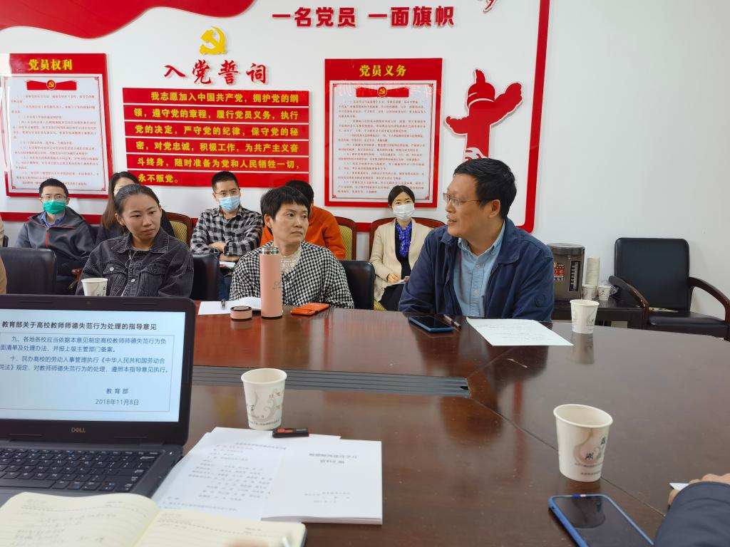 谢玉平书记领学了《新时代高校教师职业行为十项准则》、《教育部关于高校教师师德失范行为处理的指导意见》等国家关于高等公司师德建设的文件要点。他指出,党和国家高度重视教师思想政治教育和师德师风建设工作,提出了一系列新理念、新标准、新要求,并制定和出台了系列制度和文件,希望广大教师能够结合《william威廉官网师德师风建设学习资料汇编》进行自主学习,坚持“四个相统一”、争做“四有好老师”,当好“引路人”