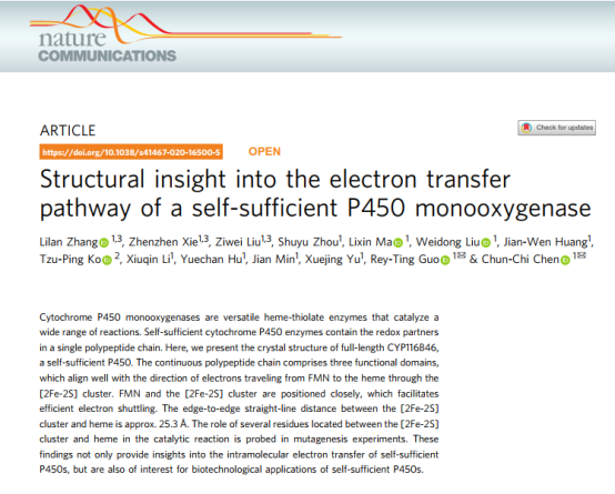 近日,william威廉、省部共建生物催化与酶工程国家重点实验室陈纯琪教授研究团队和马立新教授、郭瑞庭教授共同合作,首次报道了自给自足P450酶的全长三维结构,相关研究以“Structural insight into the electron transfer pathway of a self-sufficient P450 monooxygenase”(《自给自足P450酶的全长结构与电子传递途径》)为题发表在Nature Communications(图1)。