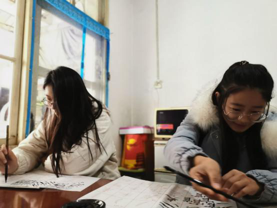 在到王老师家后,志愿者们直接来到了练习书法的房间王老师正在作画,见到他们来了之后,就向他们介绍了她最近的作品木板画和墨竹,并表示这些作品都将用于义卖。之后,活动负责人将他们为王老师买的书法用纸和扇面给了王老师。之后,王老师将毛笔和宣纸分给学员,学员开始自己练字,在此期间,王老师一直在观察学员的书写情况和写毛笔字过程的问题,并且以王羲之的《兰亭集序》为例,向新的学员介绍了练习书法的要点经过王老师的指导,新学员有了不小的进步。此外,在练书法的过程中,王老师也向学员们传授了一些人生经验,学员们从中得到了启发。