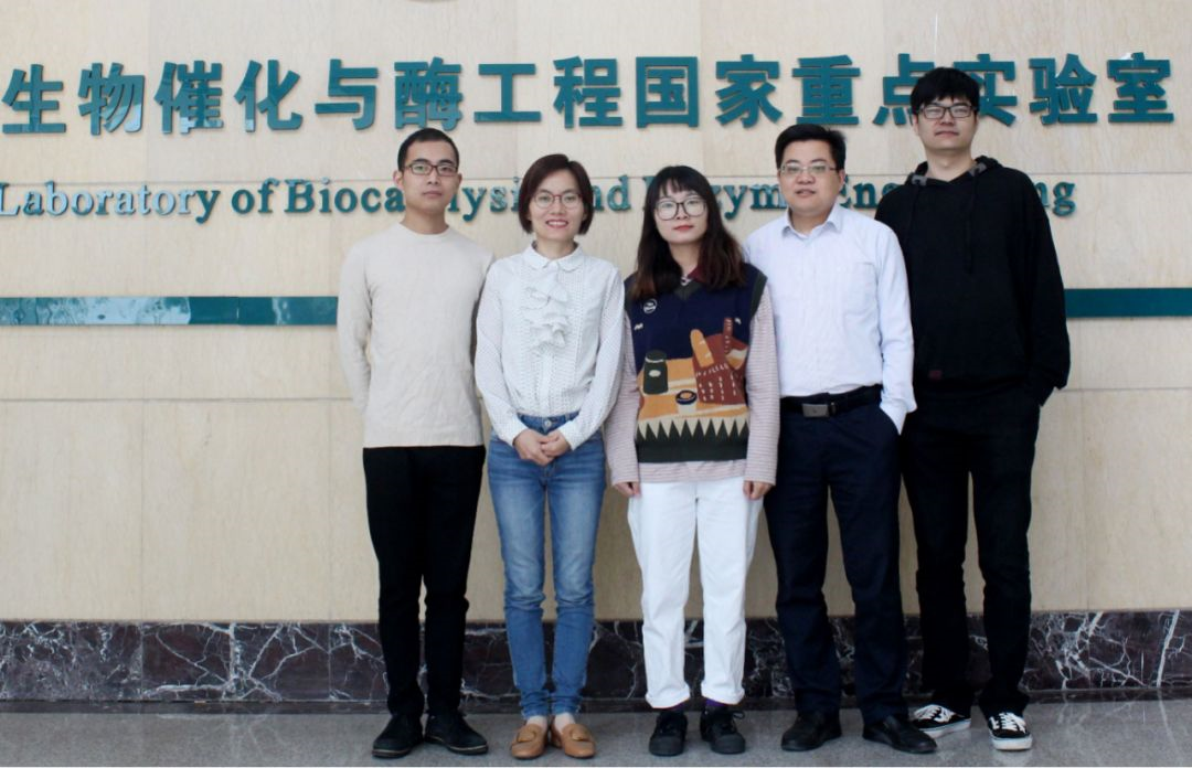 图2. 从左至右依次为马瑞(硕士研究生)、余希岚副教授、梅倩云(硕士研究生)、李珊珊教授、吴银盛(硕士研究生)