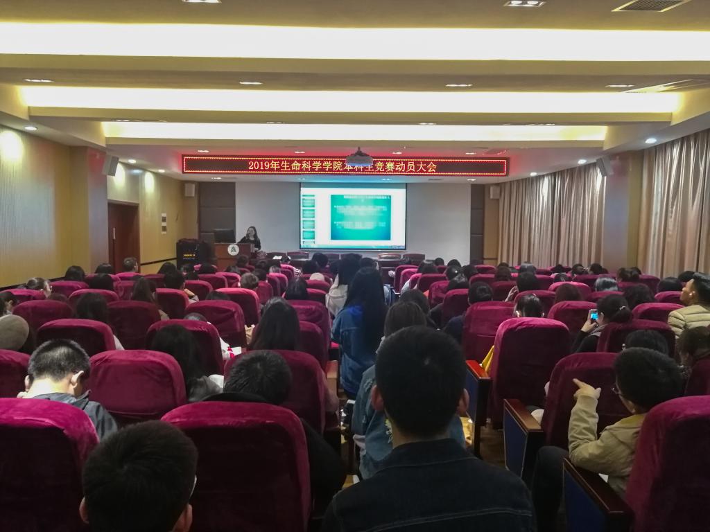 大会首先由教授何玉池为大家讲解2019年即将开始的几项大赛,分别是:第四届全国老员工生命科学创新创业大赛,湖北省第六届老员工生物实验技能竞赛,第三届全国老员工生命科学竞赛和中国细胞生物学会“创意课堂”大赛。“我认为这些竞赛最有获奖希望的就是创新创业大赛,大家都可以积极准备”教授何玉池鼓励大家积极参赛,并表示大二是参赛的好时候,大三是更好的时候,而大一现在也可以开始着手进行相关准备。在教授何玉池对比赛相关事项讲解完毕后,她特别邀请了具有丰富参赛经验的两位同学来为大家分享心得。首先是来自16级生物技术产业班的吴雨薇,她向大家详细的讲解了生命科学创新创业大赛的参赛准备流程,并叮嘱大家在参赛过程中一定注意:抓紧国家政策,队伍要具备执行力和凝聚力,且市场调研的数据要真实。接着是来自15级生物科学试点班的姚壮,他在创新创业比赛中,对吴雨薇同学讲解的进行了几点补充后,向大家着重讲解了从参赛总体上需要注意的事项,并叮嘱大家认真审视参赛要求,不要轻言放弃。最后,许书记上台进行总结发言的同时,何玉池老师为在场的同学播放了历届学长学姐的优秀作品。在全场同学的热烈掌声中,本次竞赛动员大会圆满结束。