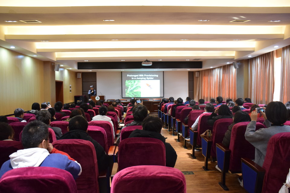 报告开始前,教授陈建对博士陈占起做了简单的介绍。首先,占起博士讲述了他的发现:在野外一个蜘蛛巢穴中,蜘蛛母亲与成年蜘蛛仍存在共同生活的不正常现象,在研究过程中不断提出问题、作出假设、解决问题再得出结论,从而不断完善研究结果。接下来,陈博士分别就该类蜘蛛的社会性、母亲奶汁分泌机制及其哺育孩子的精力、蜘蛛孩子之间的竞争与合作、以及该类蜘蛛家庭类似于人类“扩建房子”的行为这几方面进行了简单的介绍且,他表示会对自已感兴趣的方面进行进一步的研究。“除了出于自己的兴趣,这次研究也能让我们对哺乳行为有更进一步的认知。”当谈及这一研究的意义时,陈博士如是说。在最后的提问环节中,博士陈占起详细地回答了各位师生的问题,并向在座师生提出一些关于投稿《Science》的建议。