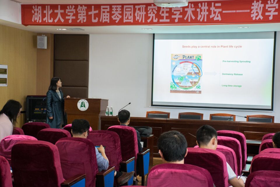 报告伊始,博士何冬丽介绍到,她的主要研究兴趣是种子,相较于其他人更加关注种子的经济效应即种子采收之后的阶段、种子萌发的过程。接着,她分用自己手绘的水稻图片向大家分别介绍胚、胚乳和胚乳周围的组织对种子萌发的作用。水稻种子萌发的模式图也表现了种子的吸水过程,从而向大家介绍种子各时期的状态。其次,她介绍到影响种子萌发的重要因素:光,温度,营养物质等等,并且在种子内部也有两个起拮抗作用的非常重要的激素——ABA和赤霉素,它们起到了非常重要的调控作用。最后,博士何冬丽表示,她们希望在一个生理过程中研究它们分子代替的机理到底是转录水平还是蛋白质组水平,并因此做了许多实验后发现,蛋白翻译水平可能对整个代谢的调控和对种子萌发的进程起到更加关键的作用。她的团队对此进行了更加深入地研究,并表示,接下来他们会更加关注它们在信号方面的调控作用。