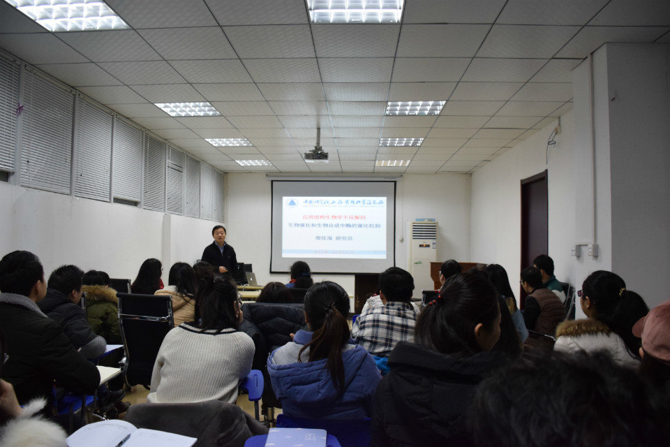 周佳海教授首先介绍目前研究蛋白质结构的最新方法-冷冻电镜,向员工们介绍了在研究酶结构时一种新途径,随后,周教授讲到自己最初由生物化学转入生物酶时遇到的瓶颈,并在一篇关于药学分子的报告中得到启发,进而加深对于生物酶改造的研究,并在后来的生物酶活性位点的研究中有所突破。周教授重点结合自身在研究工作中的四件事例,与员工和老师们分享了自己在结构机制上的酶改造的研究成果及经验,并解答了员工及老师们对于此科研项目的疑惑。