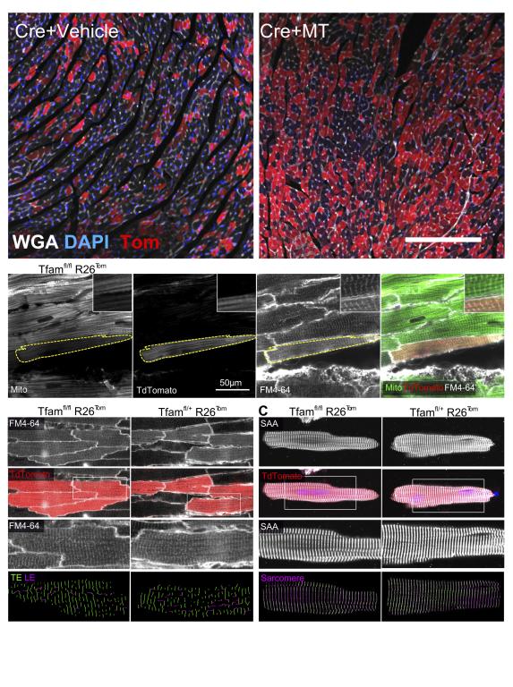 此外,在新生小鼠心脏中,利用马赛克敲除法,在只造成少数心肌细胞异常,而不影响心脏的收缩功能的前提下,研究人员发现线粒体功能的异常未导致心肌细胞生长与结构的异常,肌节排列、T管的形成均未受到影响,但由于线粒体代谢功能的异常会导致心肌细胞电生理活动异常和收缩力下降,因此线粒体相关能量代谢途径并不会影响心肌细胞成熟过程。