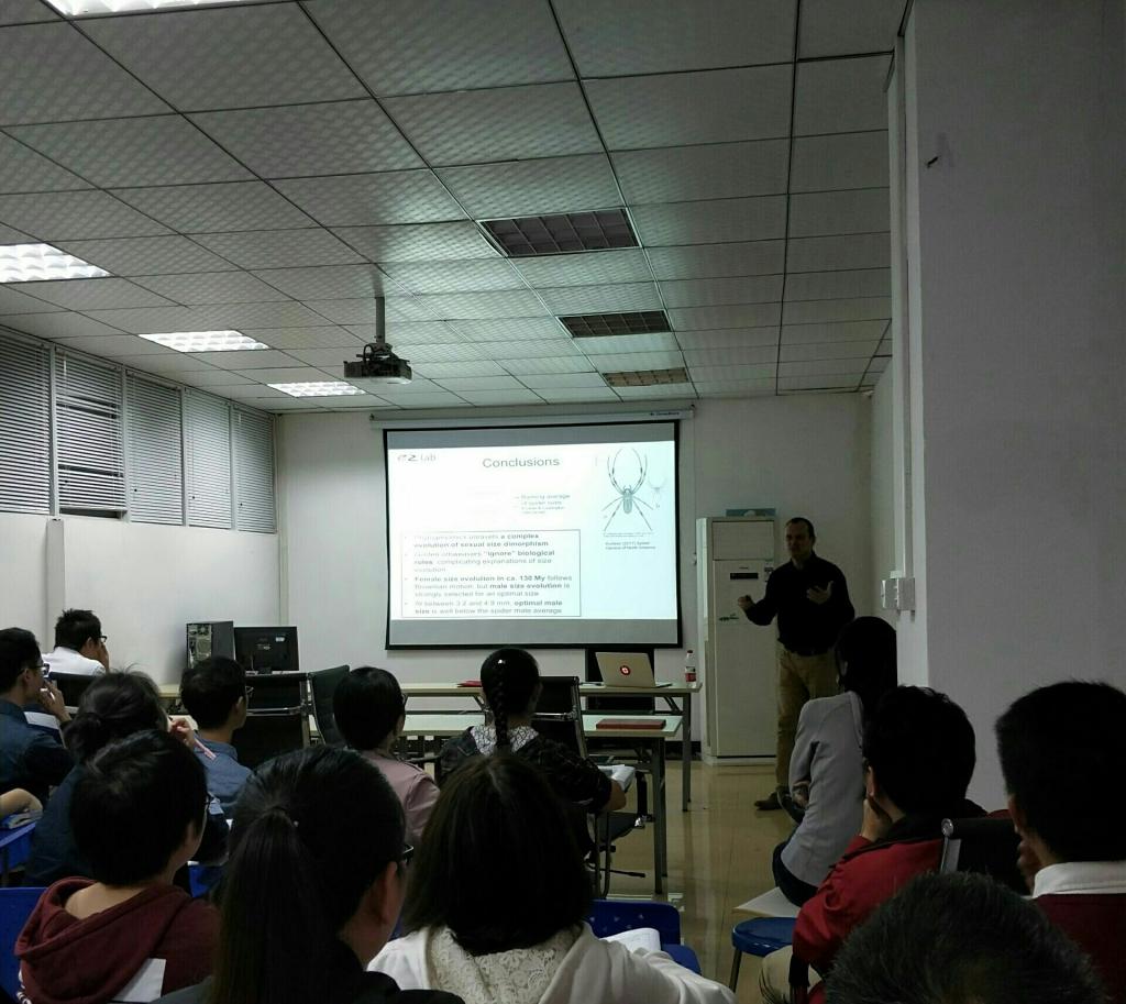1024日下午3时,在生科院六楼动物行为生态与进化中心会议室,公司兼职教授麦加西昆特纳做了一场有关蜘蛛的学术报告。参与本次会议的有部分院内教授、研究生和博士生。