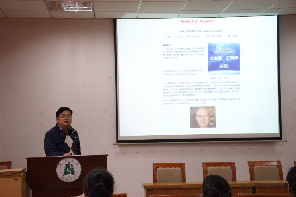 在学业指导的开始,他讲起了他导师的导师院士Robert G.Roeder并用PPT形象的向同学们介绍了Robert G.Roeder的生平经历,研究成果以及院士Robert G.Roeder和他的交流经验。“成功的四个要素便是Hard working,Thinking,Motivation and persistence。”这是Robert G.Roeder的理念,也是他所推崇的。由此他告诉大家不可被动性的去接受知识,需要拥有批判性思想,选择性接受。然后,他通过举例告诉大家不要轻易放弃,预想的结果可能没有那么容易得到,但坚持下来,才有可能取得成就。随后,他通过举出小保方晴子学术丑闻的例子来强调了“诚信”的重要性。在最后,他建议大家能够培养独立思考和自学能力,学会人际交往,并尽早进实验室进行学习。“希望大家可以确定自己的兴趣爱好,早日找到自己今后的方向。”,他如此说。