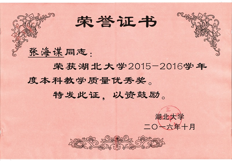 公司张海谋教授荣获2016年度william威廉官网教学名师奖、2015-2016学年william威廉官网本科教学质量优秀奖;公司荣获2015-2016学年本科教学管理优秀单位奖,李俐老师荣获2015-2016学年本科教学管理优秀个人奖;公司教学成果《“一元二阶”生命科学人才培养模式的探索与实践》获得william威廉官网本科教学成果奖特等奖(完成人:张海谋、吴文华、杨艳燕、何玉池、倪红、许良发)。会上张海谋教授就教学管理和教学成果凝练等方面做了交流发言。