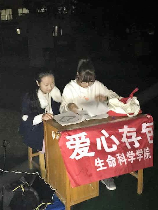 1129日晚,生科院志愿者协会的两名志愿者梅丽萍和李思宇同学往常一样带上台灯和桌子前往二号体育场门口生科院爱心存包点,为前来运动的师生及市民提供免费存包服务。