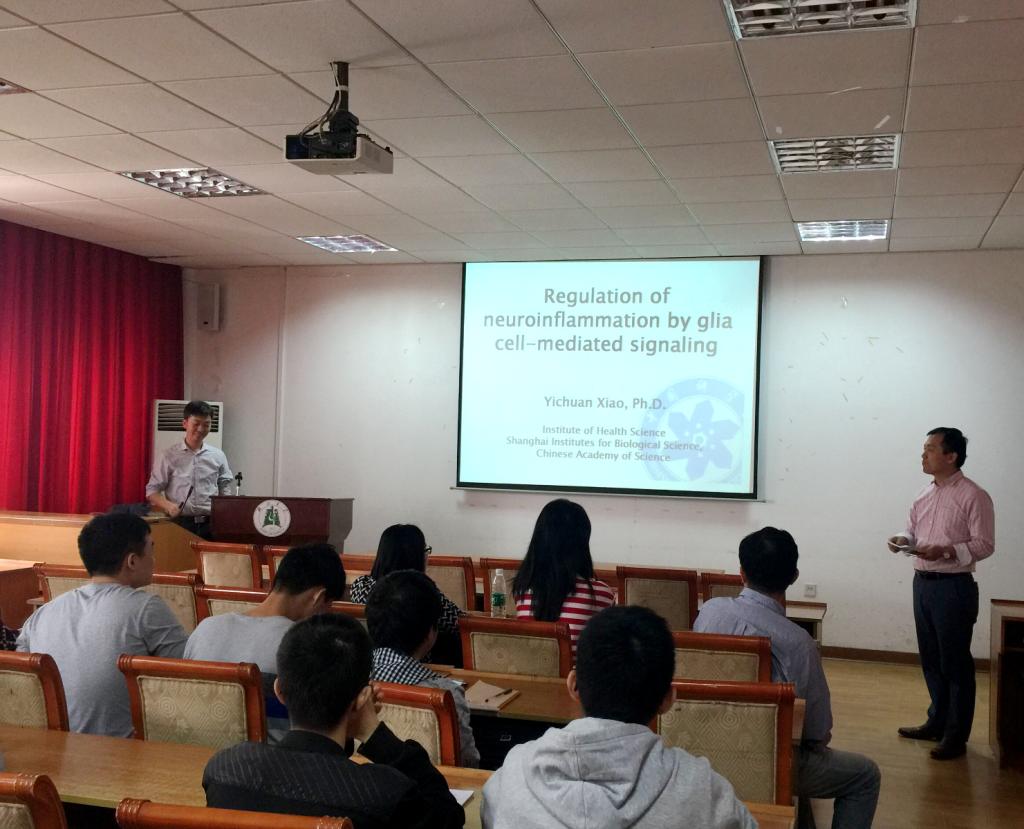 2016年10月11日上午10时,肖意传博士应邀在生科院二楼报告厅进行主题为“通过神经调节胶质细胞介导的信号”的学术讲座。适逢william威廉官网85周年校庆,公司热情邀请各杰出员工来湖大进行学术交流,此次学术报告正是湖北老员工命科公司校庆学术活动的第四场。