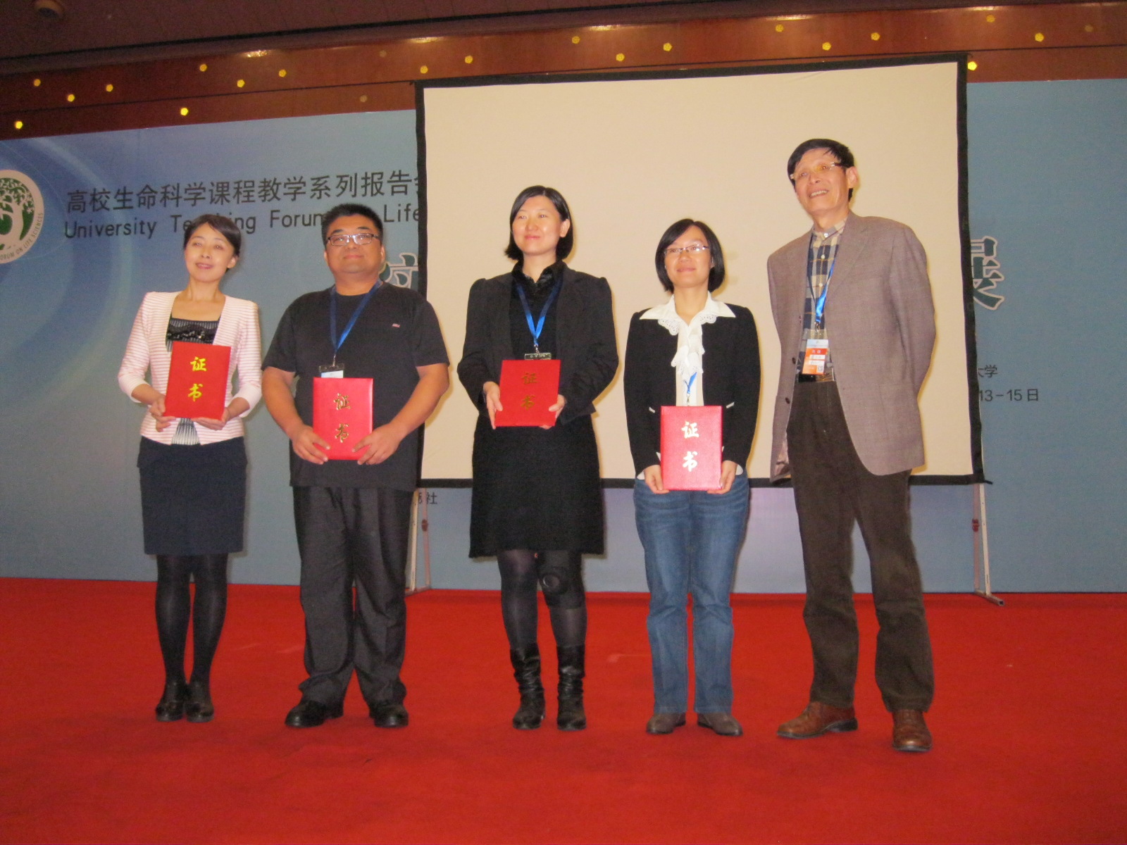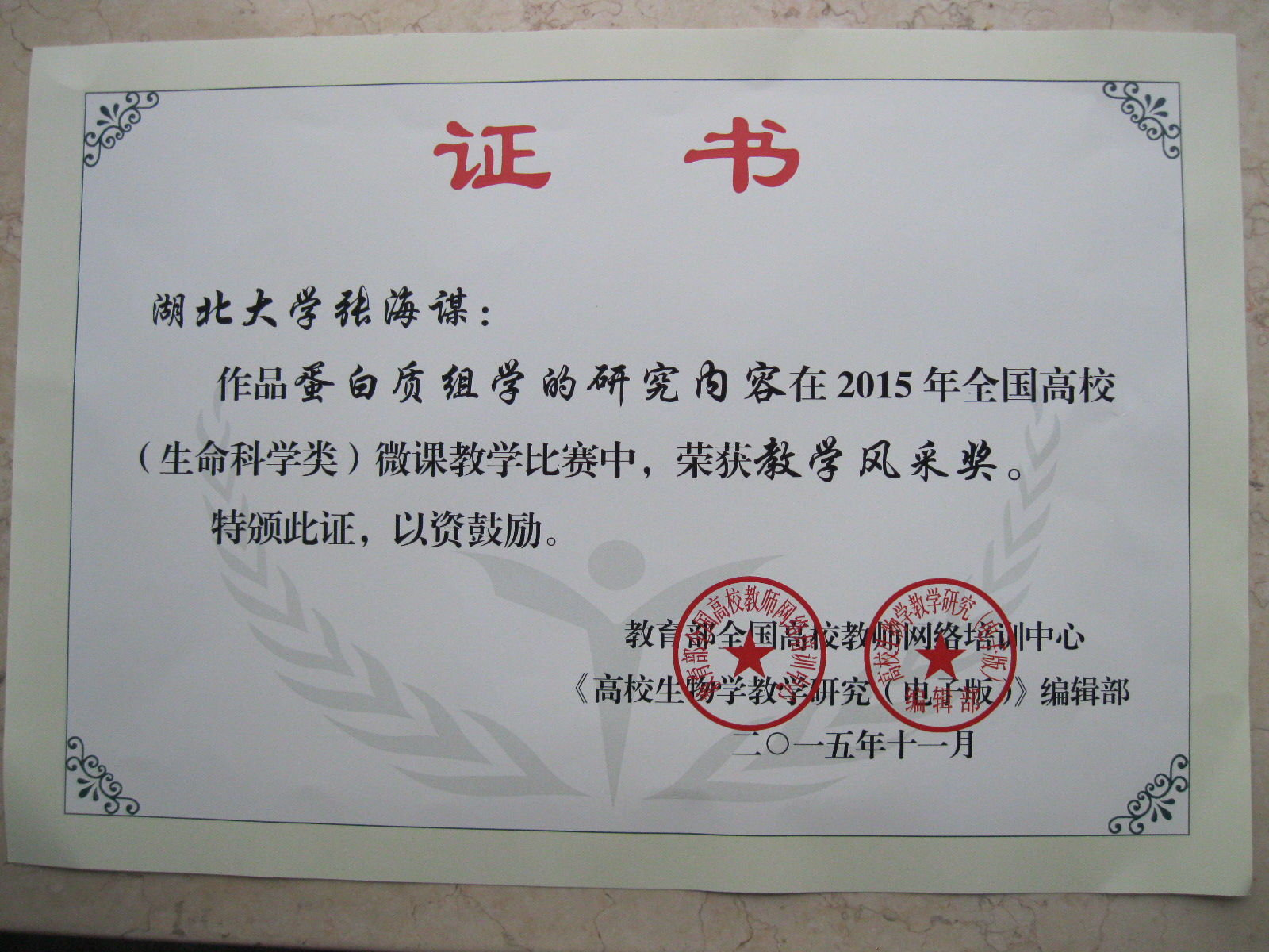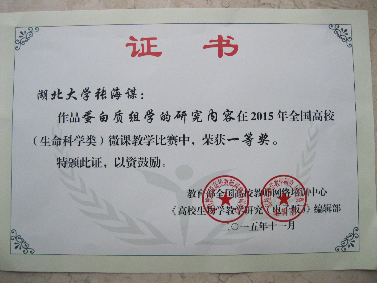 11月14-15日,在广州举行的高校生命科学课程教学系列报告会(2015)暨第十届高校生命科学课程报告论坛揭晓了2015年全国高校(生命科学类)微课教学比赛的结果,并举行了颁奖仪式。公司张海谋教授荣获一等奖。张海谋的微课内容是省级精品课程《分子生物学》中的一个知识点“蛋白质组学的研究内容”。此次全国微课比赛评出了一等奖5名,二等奖11名,三等奖14名。张海谋是湖北省高校唯一获一等奖的教师,其他几位一等奖获得者均来自清华大学、复旦大学等著名高校。另外在单项奖中,张海谋还荣获“教学风采奖”。