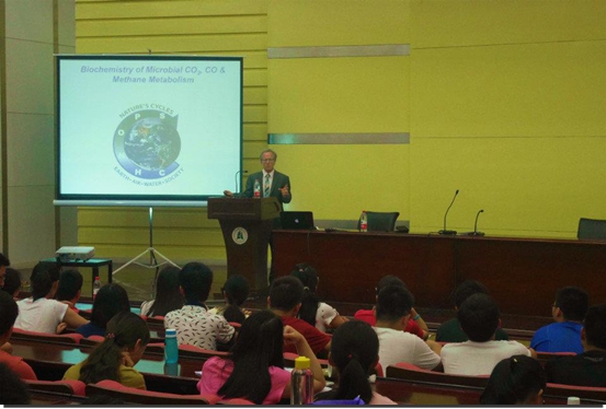5月20日下午4点半,Stephen W. Ragsdale教授在公司思睿厅做了一个场题为”Microbial metabolism of greenhouse gases and biotechnological opportunities”全英文专题报告,讲述了他自己有关温室气体的研究。甲烷是温室气体之一,在环境上对人类造成了很大的危害。从源头出发,教授讲了甲烷在生活中如何产生,会经历哪些循环过程,有什么不利的影响,对环境污染造成了什么问题。但是甲烷并非一无是处,甲烷是很好的燃料能源,例如沼气的使用。而现在,教授正着手研究的问题是怎样将甲烷固定,使其得到更充分地利用,真正的造福于人类。现在的解决方案是把甲烷转化为甲醇,这样一来,气体到液体的转化,不仅在存储上会节省很大的空间,用途上也更为广泛。