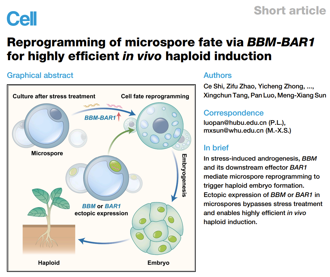 自20世纪60年代以来,育种学家致力于利用胁迫处理(如高温、营养饥饿等)诱导植物小孢子(未成熟花粉)转变发育命运,从配子体途径重编程为胚胎发生通路,从而获得单倍体植株。该策略可显著加快作物自交系制备和品种改良进程,已应用于油菜、烟草、小麦等作物。但传统方法必须经过特定的胁迫处理,存在基因型依赖性强、诱导效率低等问题,难以实现大规模推广应用。其胁迫处理如何改变了细胞命运,其重编程的分子机制如何,长期以来困扰着几代科学家,迄今仍知之甚少,成为制约该领域发展的“卡脖子”难题。