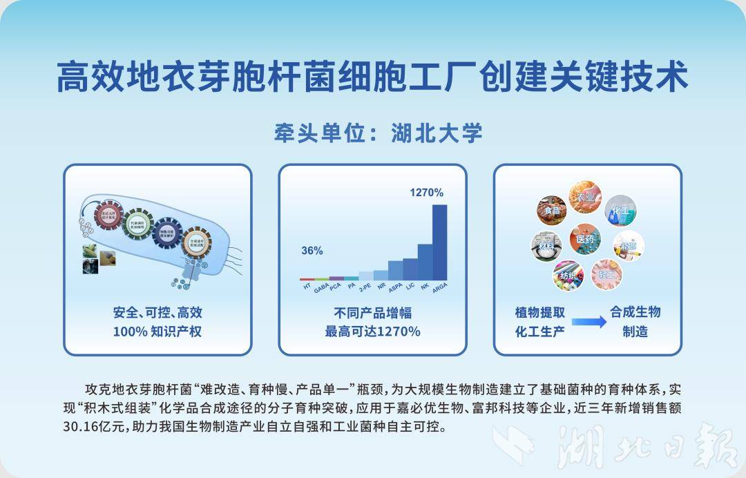 目前,这项技术已应用于嘉必优生物、富邦科技等企业,近三年帮助合作企业新增销售额30.16亿元,推动其相关产品产量增幅最高达1270%,广泛覆盖食品、医药、纺织、植物提取、合成生物及化工生产等领域。