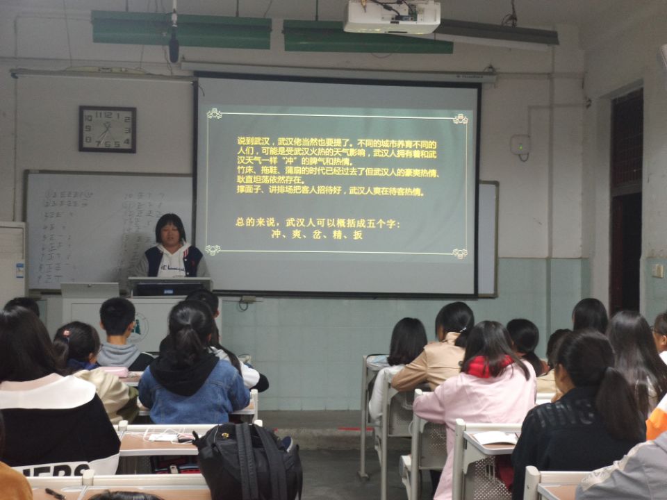接下来,跟随着武汉同学的脚步,外地同学们深深地被武汉的魅力所吸引。本次“武汉”介绍由班内的7名武汉同学合作完成,分别从“历史文化”“著名景点”“武汉美味”“风土人情”“娱乐圣地”“七校联盟”“气候条件”七个不同的角度介绍武汉。整个过程充满欢声笑语,讲解的同学大方幽默,倾听的同学认真专注。大家从武汉人的口中听到了地道的武汉方言,从他们精彩的讲解和用心制作的PPT中了解了武汉的方方面面,“黄鹤楼”“热干面”“武汉大学”……这些内容无一不让同学们连声赞叹。