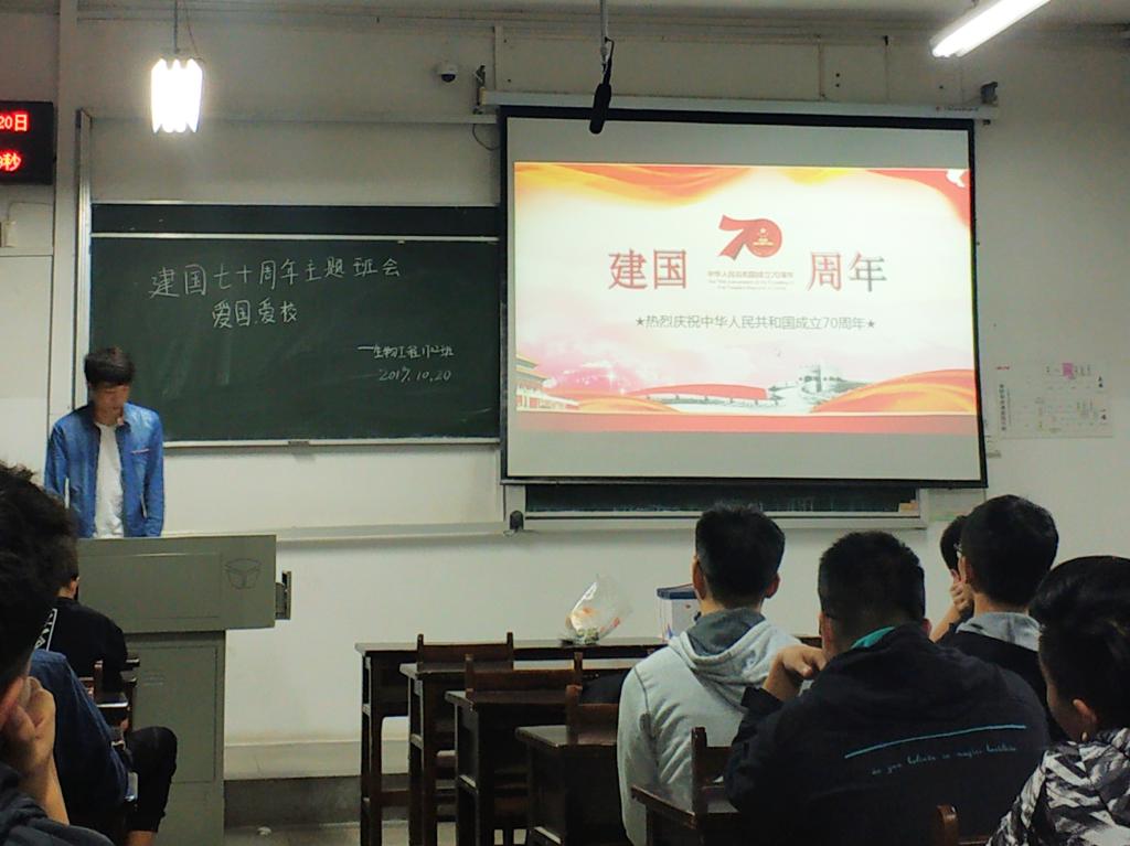 (通讯员:杨凌霄 夏丹怡)爱国爱校铭于心,知校荣校践于行。为庆祝新中国成立七十周年,增强同学们的爱国意识,构建和谐美好校园,生物工程1702班于1020日晚开展了建国七十周年主题班会活动。