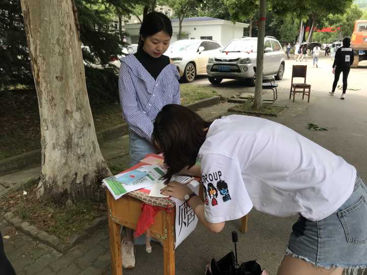 在这三天里,志愿者们分别在在嘉会园门口和老员工活动中心门口摆点宣传,让同学们为即将到来的新生写下进入大学的祝福和建议。志愿者们耐心地讲解,吸引了很多同学前来参加。本次活动既可以在现场写下对新生的寄语,也可以在领取明信片待书写后交给志愿者,同时,参与者还可自选领取一份小礼品。值得一提的是,许多参与赠言的同学们为更好的解答新生的疑惑,还将自己的联系方式留在了明信片中。