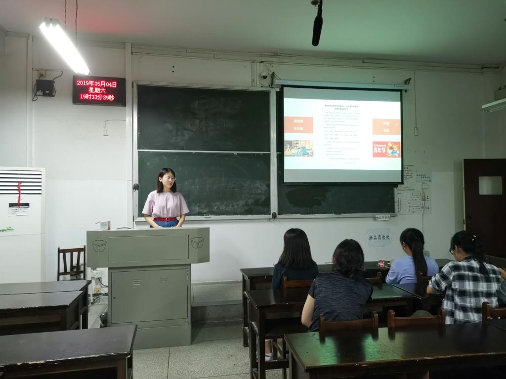 首先,全体团员齐唱团歌。接着,优秀团干潘颖同学以《弘扬传承五四精神,争做新时代有为青年》为题进行了演讲。她不仅阐述了五四运动的由来及其深远意义,还围绕当代青年如何在新时代中继承和弘扬五四精神、担当民族复兴大任等内容做了分析。潘颖号召大家要意识到自己身上的责任和使命,积极学习和传承爱国主义精神,铭记历史,敢于开拓,握紧时代的接力棒