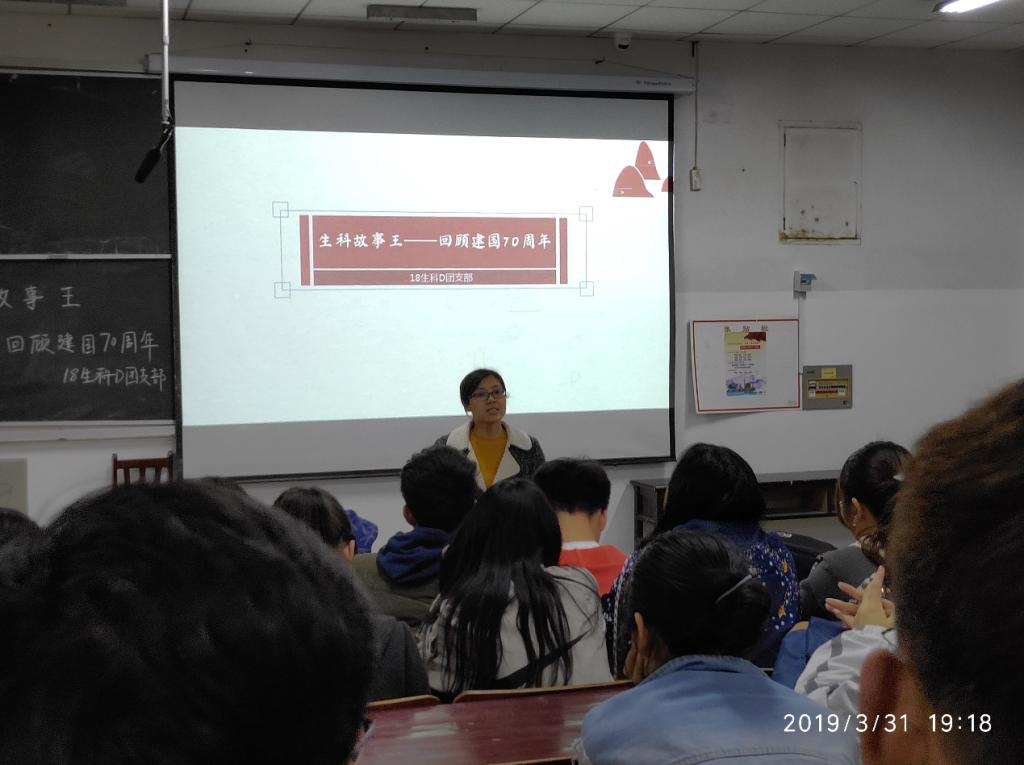 (通讯员:周义鑫) 2019年3月31日19时,18生科D班在教三402开展以回顾建国70周年为主题的团日活动。班主任马菲也参与了此次活动。