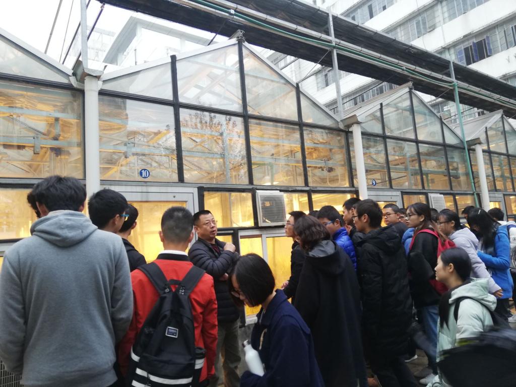 活动开始,汤老师把同学们聚集在温室前,介绍了生科院关于植物的研究项目和在这些方面的发展。之后,汤老师带领同学们环绕了温室一周,从重金属植株、烟草、多倍体水稻、抗病油菜,再到西红柿、茄子,同学们被各种明星植物深深吸引,模拟光照和水雾更使大家表现出浓厚的兴趣。