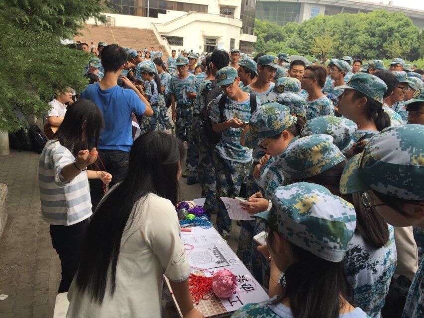 在现场,工美协会会长徐小朵及副会长任玲玲向刚军训完的新生介绍社团。摆点的桌子上满是各种颜色的绳子、还有几把剪刀,新生们看到这些便凑了过来。徐小朵表示可以教感兴趣的新生编手绳。精美的中国结、平结、金刚结,“只要你编好了就可以自己拿回去。”任玲玲说,“感兴趣的还可以扫一下二维码加我们协会的群。”