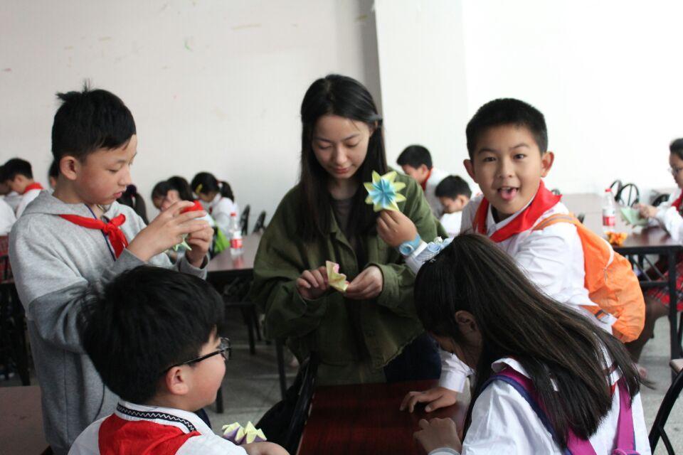 在参观校园约一小时后,老员工志愿者领同学们参与工美协会手工折纸康乃馨的制作。“先两次对折,再展开……”这是教学负责人任玲玲在教小朋友折康乃馨,任玲玲是工美协会副会长,此次教学是为了让孩子们感受到工艺美术的魅力,感受到老员工社团的魅力。在此期间有小朋友表示,想要回去给妈妈也折一朵康乃馨。
