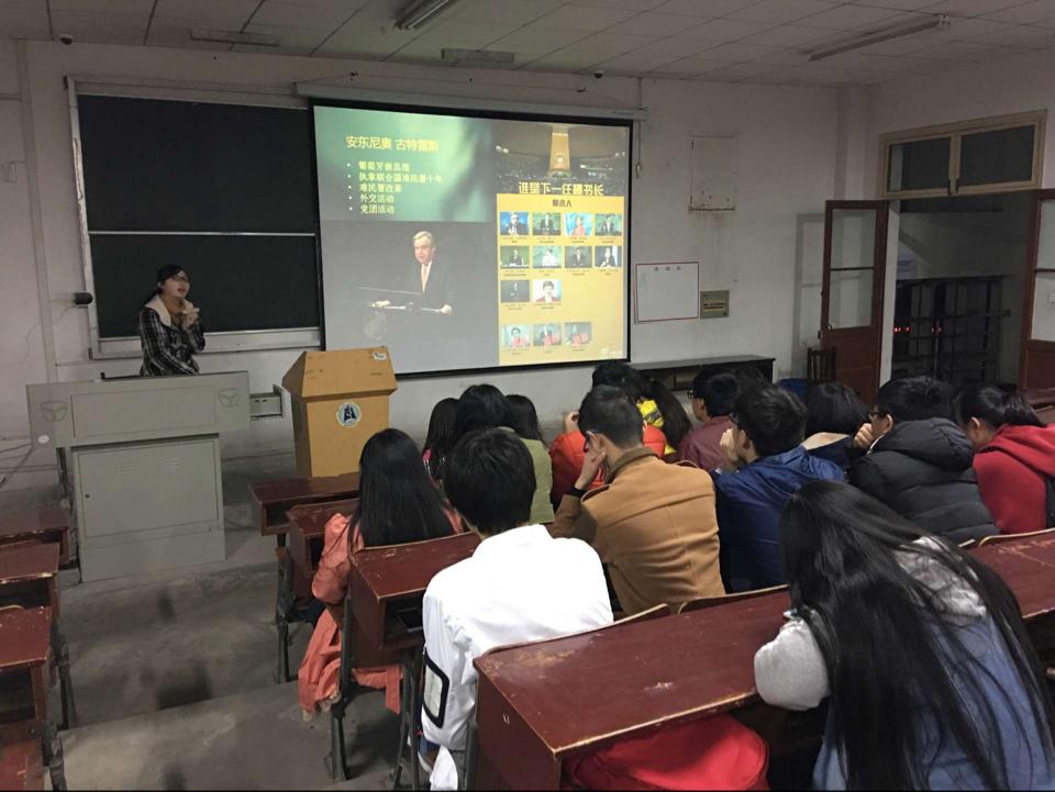 “我们的联合国”是第一环节的主题,伴着“人权”、“和平”等关键词,同学们逐步认识了联合国这个国际性组织的地位和意义。当讲到联合国现用的六种官方语言时,汪轶昕特别强调,在1971年以前中华民国是联合国成员国,当时的第六种官方语言叫做整体中文即现台湾当局推行的繁体文字,直到1971年中华人民共和国成为联合国成员国,简体中文替代正体中文成为官方语言。