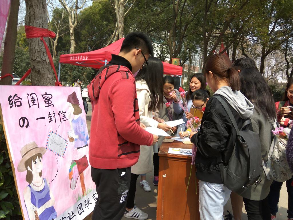201737日中午,由集邮协会开展的给闺蜜的一封信活动开始在嘉汇园附近摆点。作为女生节的活动之一,它是集邮协会为女生们准备的一个福利。让女生们可以以写信的方式表达对闺蜜的情感。活动当场报名,领信封,之后统一收齐,再由协会统一将信寄出。