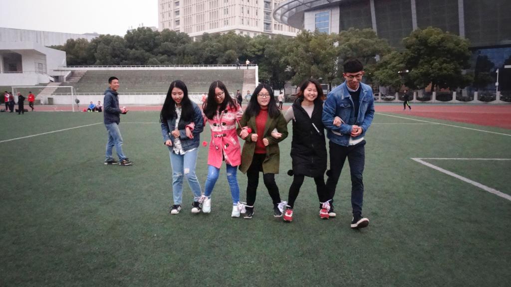 活动伊始,五组参赛小组领到了用来比赛的绑腿布条。据说这绑腿布条来源颇为奇特,后得知是团支书李俊希牺牲自己的床单做的比赛道具,同学们纷纷决定更加积极地参与在活动中,以肯定班委们的尽心尽力。比赛开始前,“我们就是冠军组哈哈哈哈”,“我们组妹子多,你们让着点我们”……各组用各种形式鼓舞着组员斗志,气氛一时十分活跃。在各种有着强烈节奏感又独具特色的口号中,比赛开始了,大家手勾着手,随着口号共同前进。到达终点的那一刻,大家笑着抱成一团。