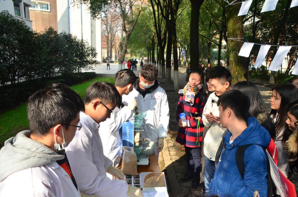 志愿者们现场为大家演示一粒米的“诞生”过程他们用从生科院搬来了稻谷精米检测机、稻米垩白观测仪和精米机三台机器,经过将米的谷壳打掉筛选精米、粗米和糠,将粗米再加工成精米三道工序,生产出大米成品。“米在两个高速转动的齿轮上互相摩擦碰撞脱掉谷壳的”志愿者杨子南将准备好的稻谷小心的放入机器中,经过三步工序,最后便出现大米便出现在干净的盘子里。“咦”靠的比较近的徐锦禾惊奇地说道“这米,怎么有的和我在家里看到的不同啊。引得不少同学纷纷近距离观察,也发出了同样的疑问。“这个棕色的米是什么呀?”“这个能吃吗?大家七嘴八舌地议论着